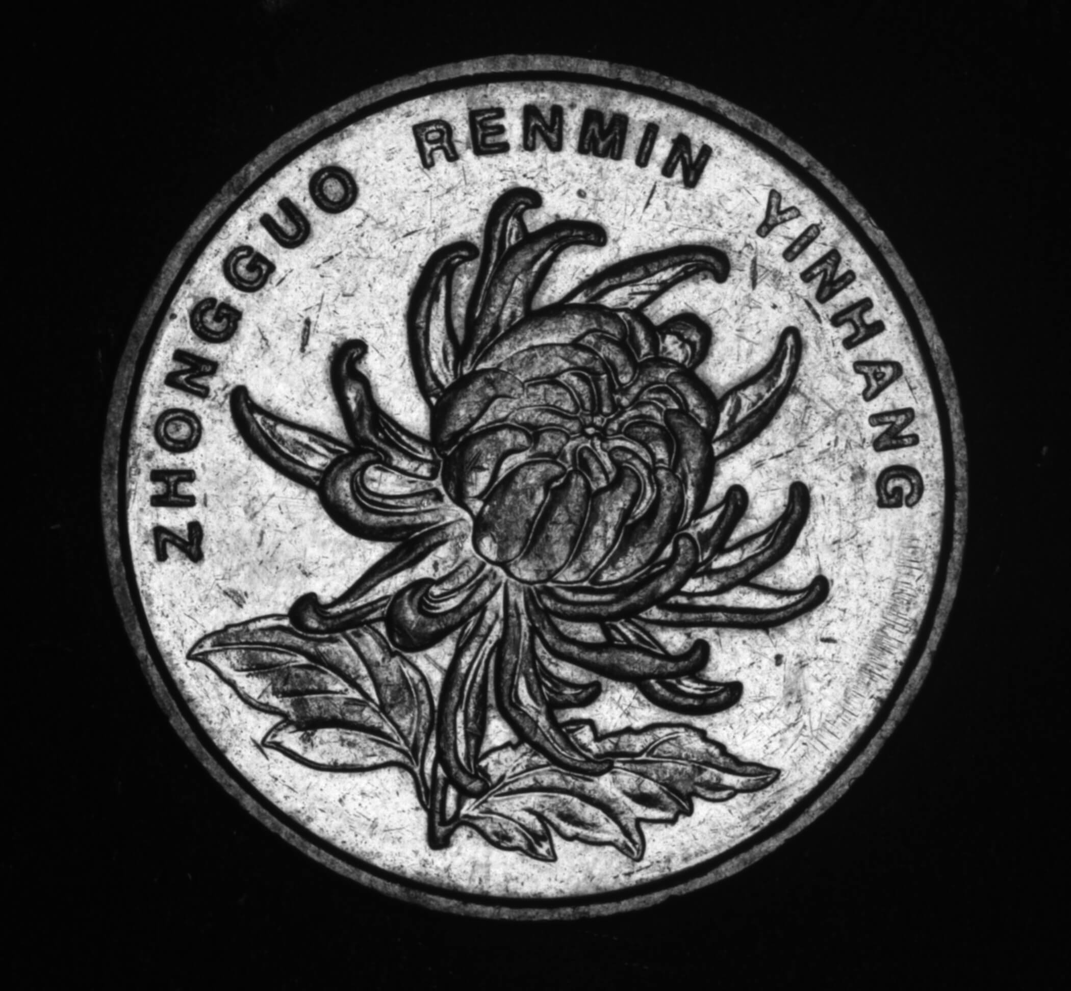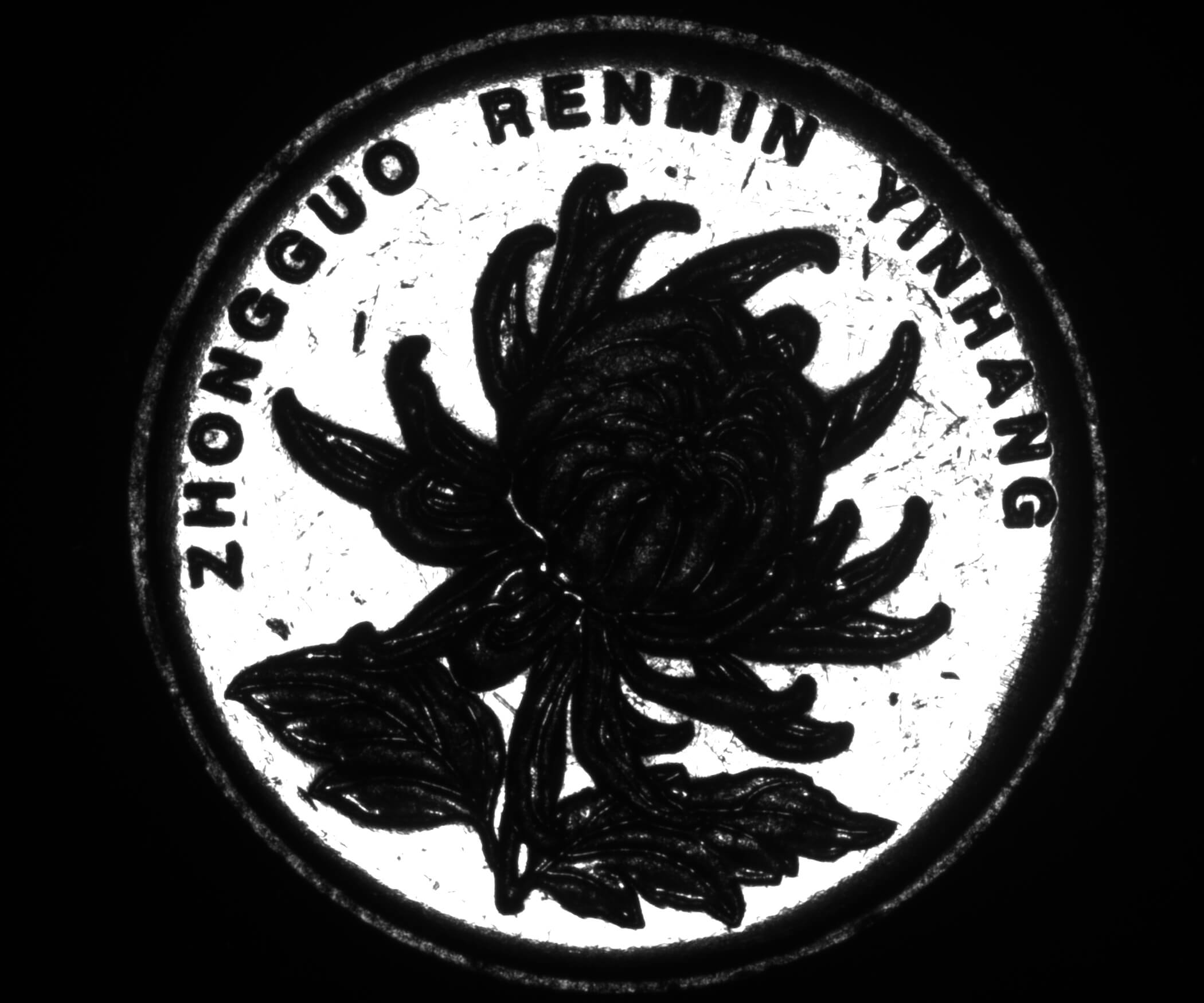 上圖為通貨硬幣,有兩面需要檢測,字符面以及花面,檢測內(nèi)容為表面鑄件崩缺、表面劃痕等缺陷。表面銀色光滑面,反光嚴(yán)重,字符面內(nèi)容稍微簡易,花紋面表面復(fù)雜,對于高要求檢測光源選型難度高。