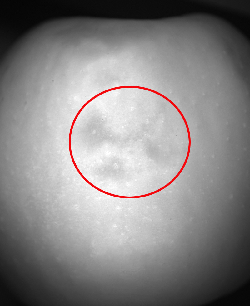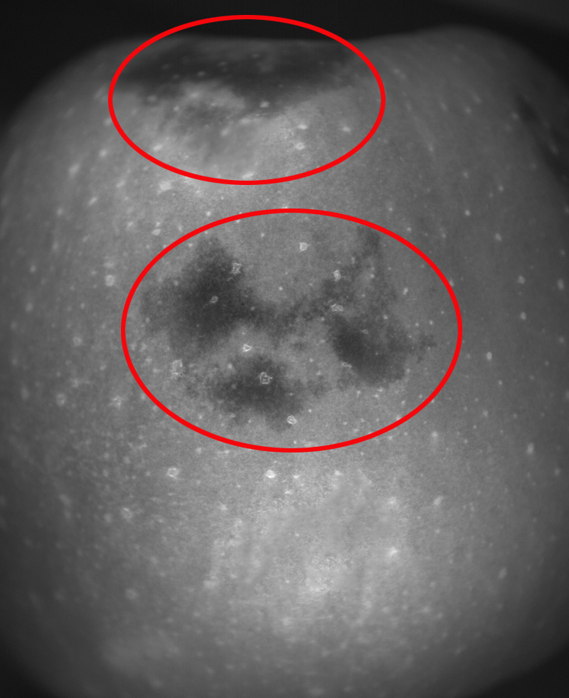 產(chǎn)品的檢測(cè)和分類是SWIR最有前途的機(jī)器視覺應(yīng)用之一。例如在該波長(zhǎng)的物體圖像中,水幾乎是黑色的,因?yàn)樗?450nm和1900nm都有很強(qiáng)的吸附性。因此,使用合適的SWIR光源可以清楚地顯示受損水果、散裝谷物或灌溉良好的作物的水分含量。