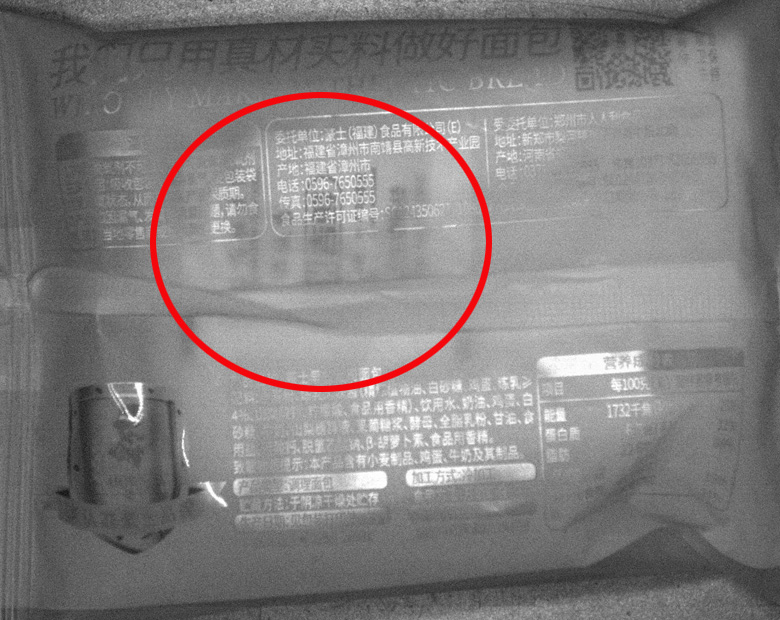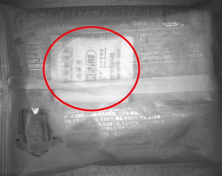 食品包裝常檢的有食品的完好、有無放防腐劑包等。下圖中近紅外照明對(duì)比不夠明顯,而短波紅外光源穿透性強(qiáng)照明對(duì)比大大提升。