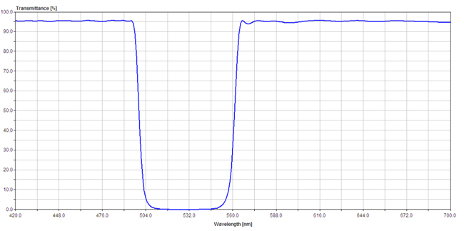 陷波濾光片設計用于在濾光片設計范圍內透射所有其他波長的同時阻斷預選的帶寬。陷波濾光片適用于從光學系統(tǒng)移除單個激光波長或窄帶。