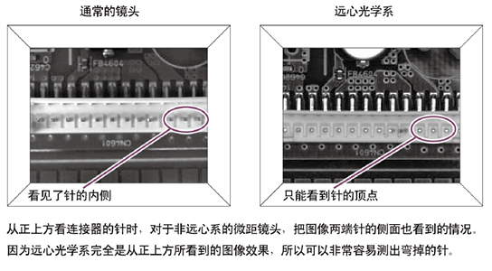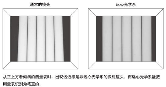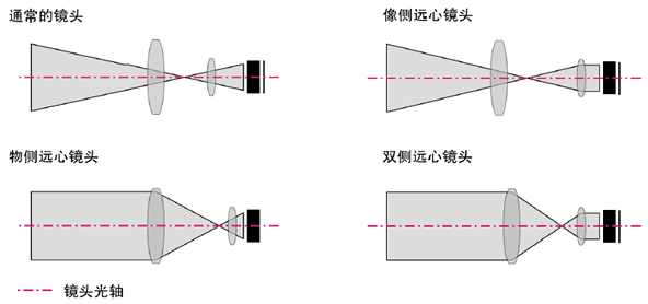 對于鏡頭光軸,主光線與其平行的鏡頭。當需要同軸落射照明的時候,物側(cè)遠心鏡頭是有效的。對于被拍攝物體,有利于接受垂直照明的正反射光。在景深方向的尺寸測量時,數(shù)值的變動小,周邊幾乎不會變形,適用于高精度測量。