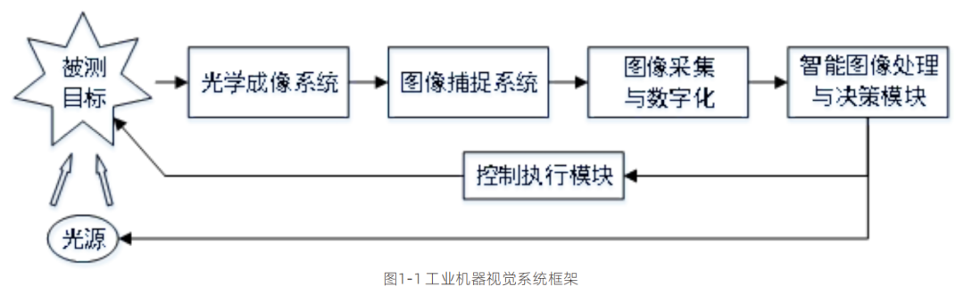 機(jī)器視覺是以普通計(jì)算機(jī)視覺研究為基礎(chǔ),并且同時涉及到光源照明技術(shù)、高速圖像采集等方面實(shí)用技術(shù)的研究。在工業(yè)中,利用機(jī)器視覺構(gòu)建一個完整的工業(yè)視覺應(yīng)用系統(tǒng)需要結(jié)合多種技術(shù),其中涵蓋了機(jī)械工程、傳感器、光學(xué)成像、運(yùn)動控制、圖像處理等方面。圖1-1顯示的是實(shí)際工業(yè)中機(jī)器視覺系統(tǒng)整體框架,主要包括被測目標(biāo)、光源、光學(xué)成像系統(tǒng)、圖像捕捉系統(tǒng)、圖像采集與數(shù)字化、智能圖像處理模塊和運(yùn)動控制模塊。
