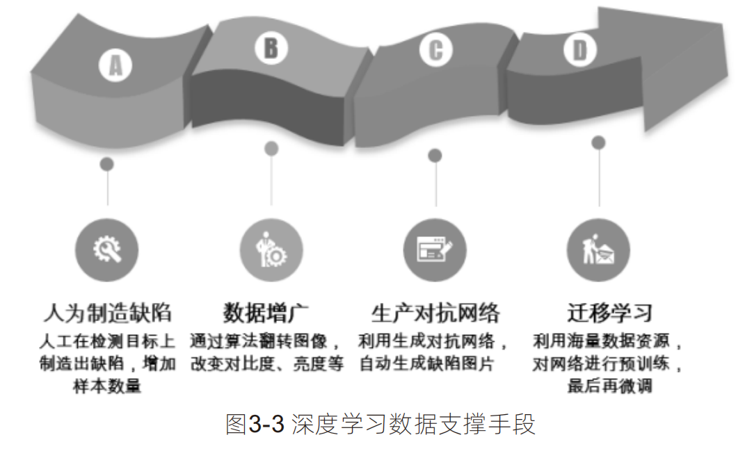 在工業(yè)領(lǐng)域中,可以在人為制造缺陷、數(shù)據(jù)增 廣、生成對抗網(wǎng)絡(luò)、遷移學(xué)習(xí)等手段解決相應(yīng)的訓(xùn) 練數(shù)據(jù)問題。如圖3-3為深度學(xué)習(xí)數(shù)據(jù)支撐手段。