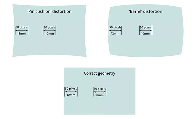 除了分辨率的變化外,所有透鏡也會(huì)受到一定的空間畸變。圖2顯示了如何以非線性方式拉伸或壓縮圖像,使整個(gè)傳感器的精確測(cè)量變得非常困難。雖然有一些軟件方法可以解決這個(gè)問題,但它們無法考慮物體的物理深度,因此最好選擇質(zhì)量好的低失真鏡頭,而不是試圖在軟件中糾正這些錯(cuò)誤。作為一般規(guī)則,較短焦距的鏡頭將具有比具有較長(zhǎng)焦距的鏡頭更大的失真,因?yàn)楣鈴母蟮慕嵌日丈涞絺鞲衅鳌J褂酶鼜?fù)雜的鏡頭設(shè)計(jì),可以保持低失真,并且許多鏡頭制造商一直在努力研究他們的光學(xué)設(shè)計(jì),使他們能夠?qū)⒖臻g失真降低到0.1%的數(shù)量級(jí)。