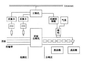 基于機(jī)器視覺技術(shù)的藥片包裝缺損檢測(cè)系統(tǒng)的硬件包括攝像系統(tǒng)和分離系統(tǒng)兩部分。