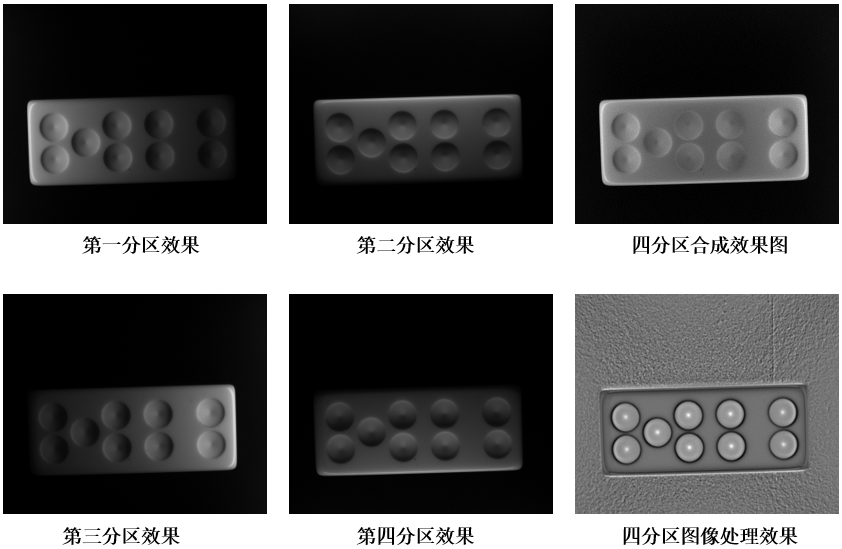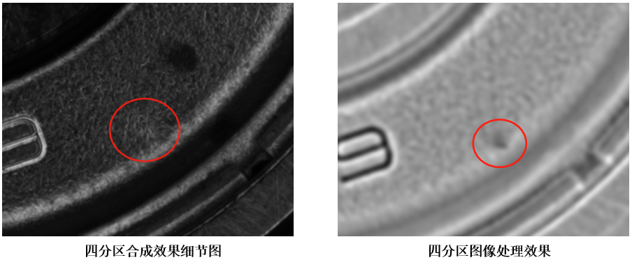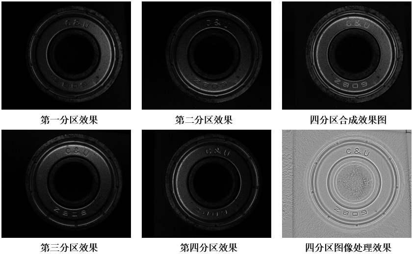 軸承上輕微的凹凸,單方向打光能突出一些微弱的效果,整體幾乎看不出效果,但是通過(guò)四分區(qū)分別成像,經(jīng)過(guò)2.5D圖像處理分析能將微弱的凹凸呈現(xiàn)出來(lái)。