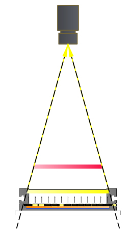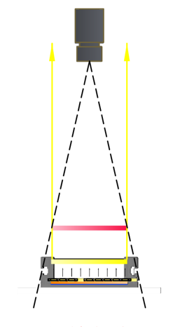 上面的兩種照射方式只說(shuō)到FA鏡頭,并且圖文也是以FA鏡頭舉例參考,那么還有一種鏡頭需要說(shuō)明,也就是常用的遠(yuǎn)心鏡頭,遠(yuǎn)心鏡頭基本為平行光路類型,所以在配合遠(yuǎn)心鏡頭選擇光源大小時(shí),我們只需要比實(shí)際的視野略大一點(diǎn)即可。如下圖所示: