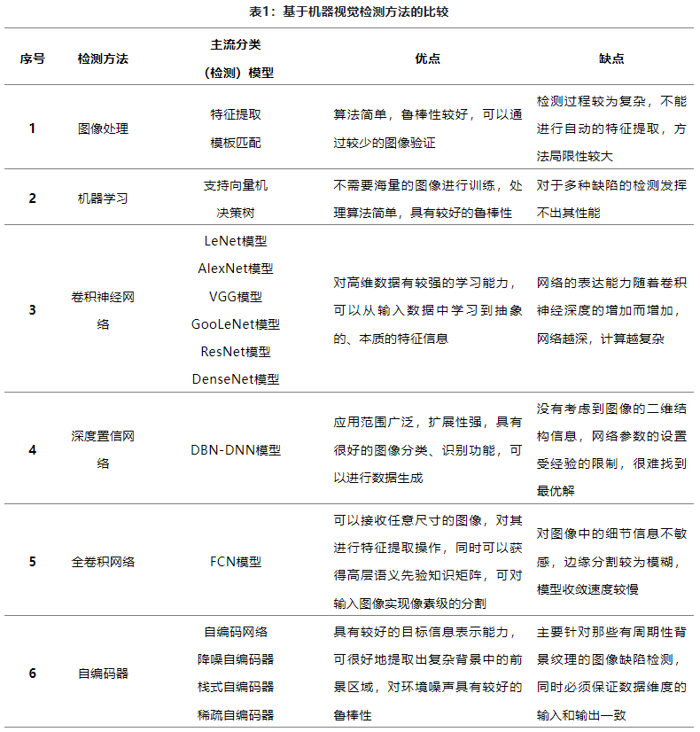基于機(jī)器視覺的缺陷檢測方法的比較如表1所示,包括各種方法的主流分類(檢測)模型、優(yōu)缺點(diǎn)對(duì)比。