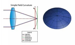 在一個平坦的影像平面上,影像的清晰度從中央向外發(fā)生變化,聚焦形成弧型,就叫場曲。場曲導(dǎo)致視場邊緣相對中心清晰度下降,也即MTF下降。