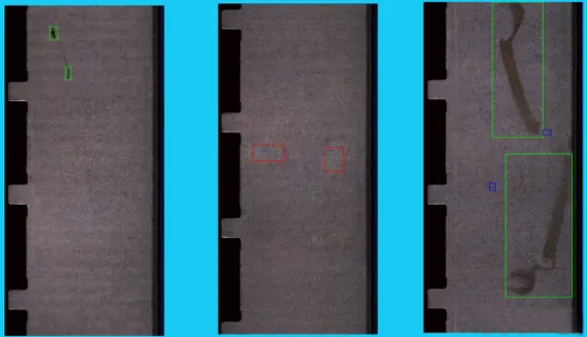 綠框標(biāo)注的是臟污,紅框標(biāo)注的是電鍍不良,藍(lán)框標(biāo)注印。