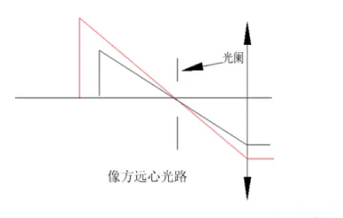 像方遠心光路的光路圖如下圖 。它是將孔徑光闌放置在物方焦平面上,像方主光線平行于光軸主光線的會聚中心位于像方無窮遠。這種鏡頭的特點是放大倍率與像距無關(guān),可以消除像方調(diào)焦不準(zhǔn)引入的測量誤差。