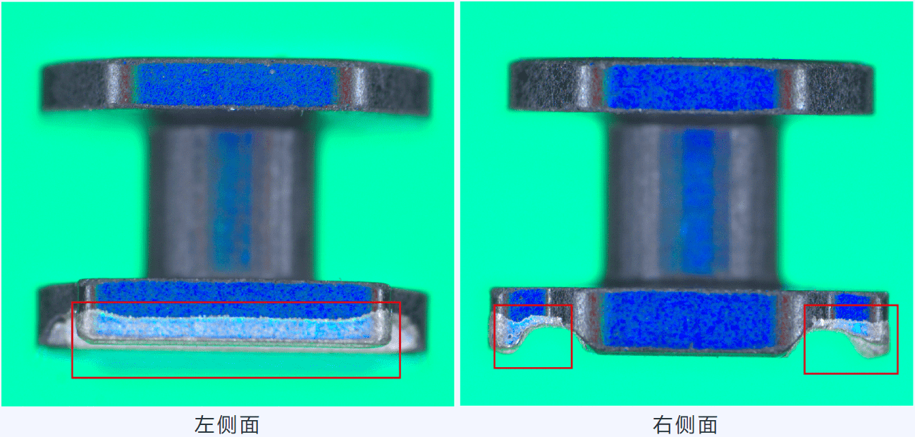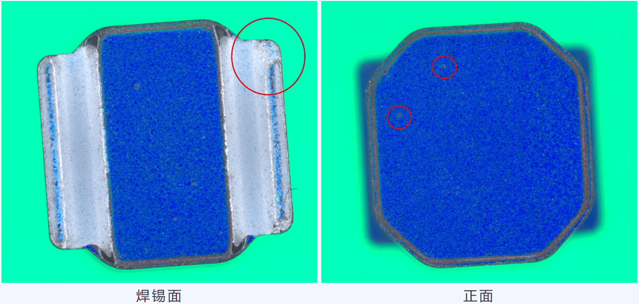通過多色打光方式,使缺陷與正常背景面具有不同顏色區(qū)分,讓缺陷凸顯出來。如焊錫面右邊崩缺,藍(lán)色覆蓋面積變小變短明顯,正面崩點(diǎn)具有異樣的顏色對比,其他面效果類似,這些非常明顯的圖像對比信息,很好的方便后續(xù)機(jī)器視覺算法分析處理。