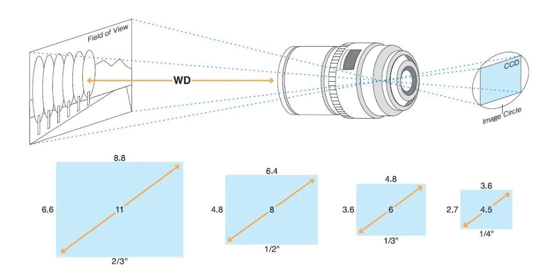 傳感器尺寸大,在同樣的像素密度下,像元尺寸也會(huì)大,這樣會(huì)增加每個(gè)像元的感光面積,對(duì)提高圖像的質(zhì)量有益。傳感器的尺寸,還能決定視野大小與工作距離。在同樣的工作距離、同樣的鏡頭下,傳感器尺寸大,可以拍攝更大的視野。