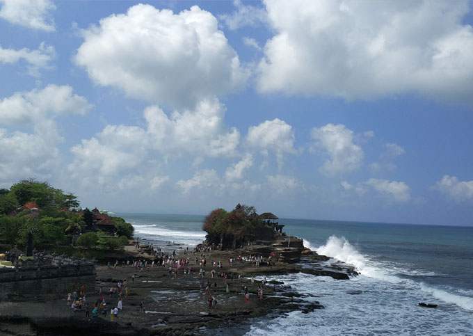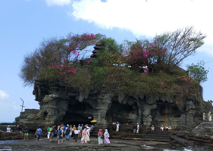 海神廟始建于16世紀,供奉著巴厘島諸神,是巴厘島三大神廟之一,也是七座瀕臨海岸的廟宇中最著名的。該廟坐落在海邊一塊巨大的巖石上,每逢潮漲之時,巖石被海水包圍,整座寺廟與陸地隔絕,孤零零地矗立在海水中;只在落潮時才與陸地相連。