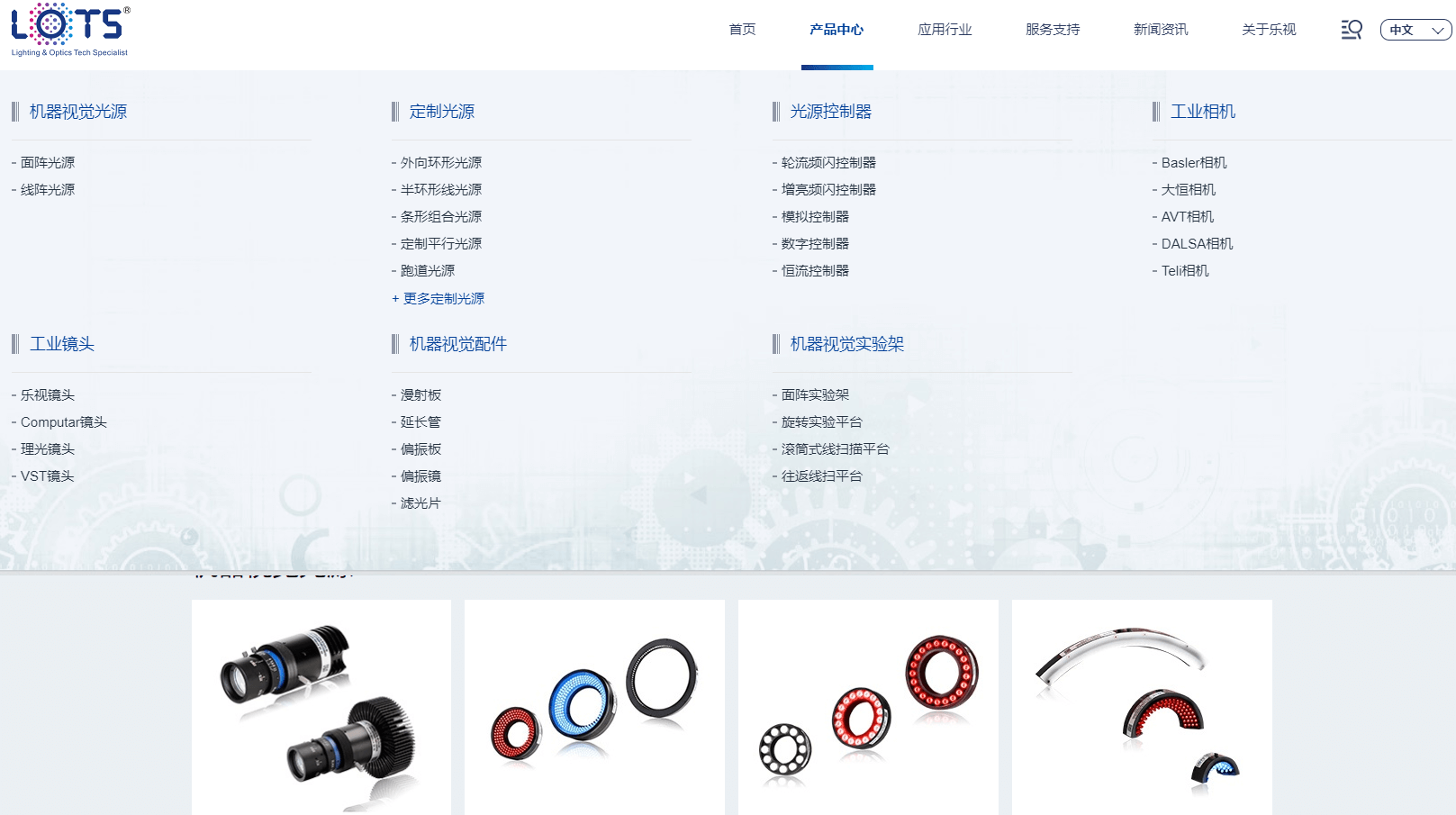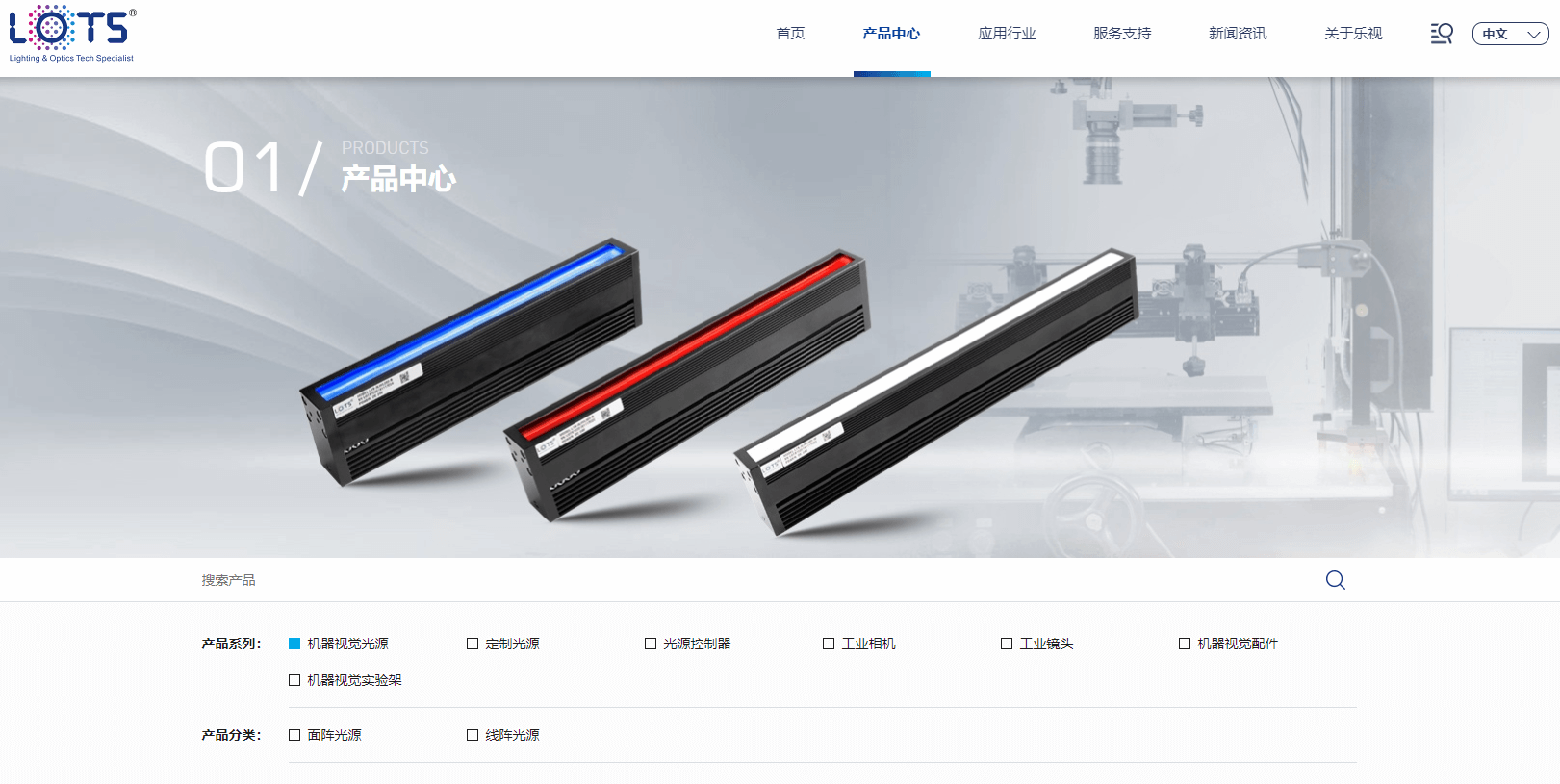 產(chǎn)品中心是樂視科技主要核心欄目,二級欄目包含機(jī)器視覺光源、定制光源、光源控制器、工業(yè)相機(jī)、工業(yè)鏡頭、機(jī)器視覺配件、機(jī)器視覺實驗架等幾個大類,產(chǎn)品內(nèi)頁附有最新規(guī)格參數(shù)、圖紙下載,供您方便查閱。