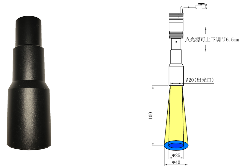 需要配合點光源使用,其設(shè)計是將點光源出光口的光經(jīng)過透鏡后形成一束平行光,光束的光斑大小可以通過調(diào)節(jié)兩個透鏡間距來控制。設(shè)計簡單,能滿足平行光源的特性。