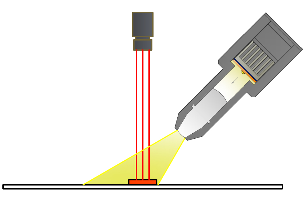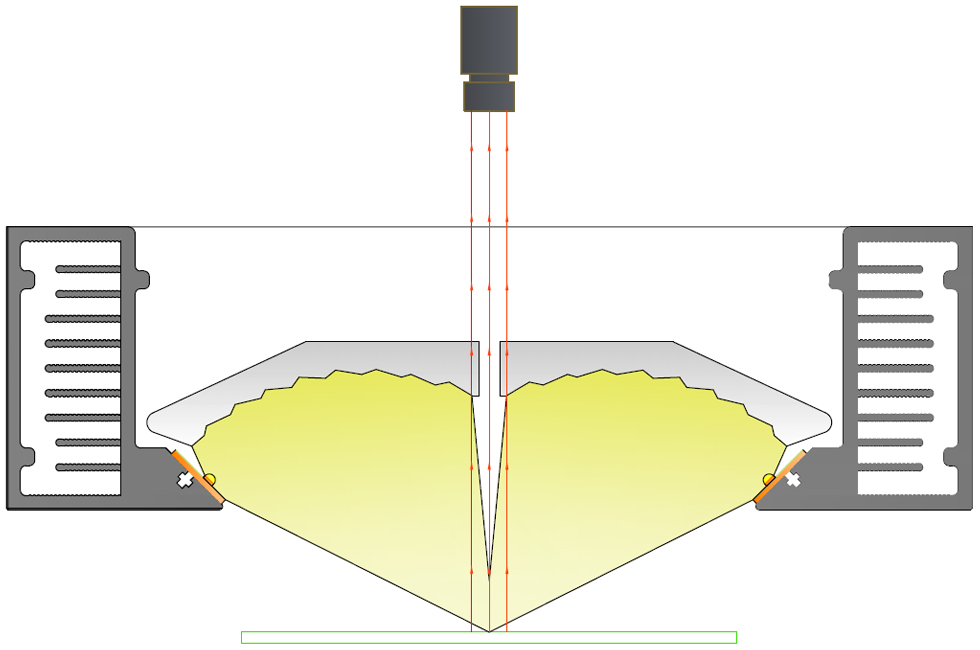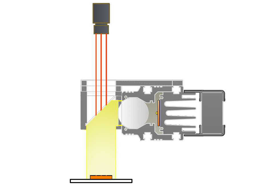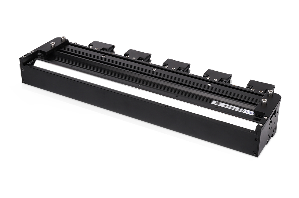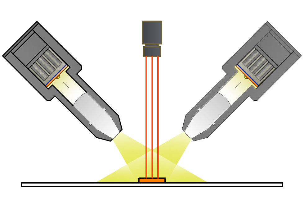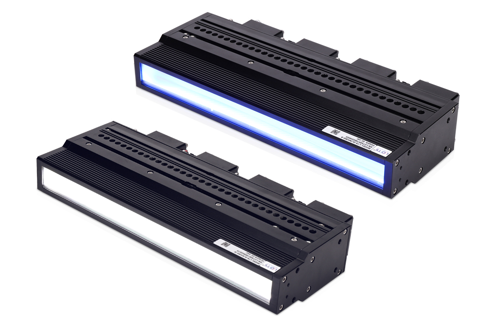 線光源:線光源有兩種照射方式,分別為單條線光與雙條線光對射。通常我們采用單條照射,如果產品有邊有高度差(單條會有陰影影響),或者均勻性需要加強可以考慮雙條線光對射。線光源比較靈活可以擺放任意角度,可明、暗場照射。光路非常聚集方向性強。