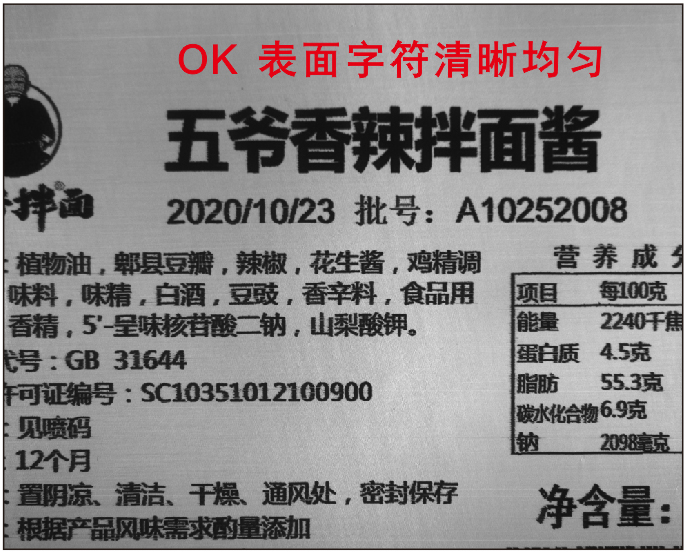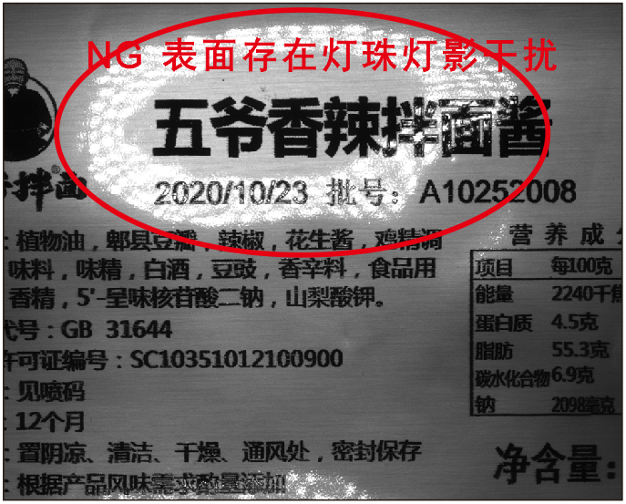 圖1為高角度環(huán)形光源照攝,包裝袋上能明顯看到環(huán)形光源燈珠燈影,干擾字符識別;圖2為高角度環(huán)形光源加偏振照攝,包裝袋上環(huán)形光源燈珠燈影消失,字符清晰可見。