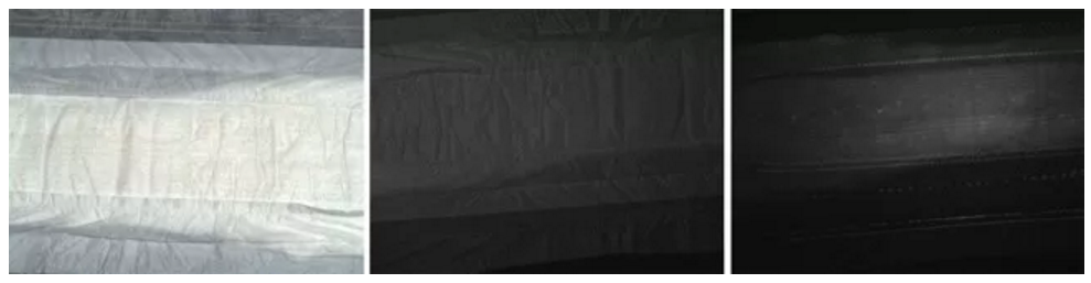 舉一個(gè)例子,生產(chǎn)紙尿褲的廠家希望檢測(cè)針腳是否完整。由于針線上有熒光,UV光可以用來將肉眼可見但不明顯的針線打出高的對(duì)比度。由于彩色圖像不能顯示針腳(圖左),用365nm的光源照射(圖中間)可以提供比395nm更高的對(duì)比度(圖右)。