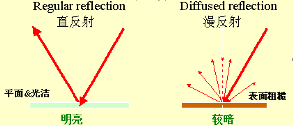 漫反散:照射到物體上的光從各個(gè)方向漫散出去。在大多數(shù)實(shí)際情況下,漫散光在某個(gè)角度范圍內(nèi)形成,并取決于入射光的角度。
