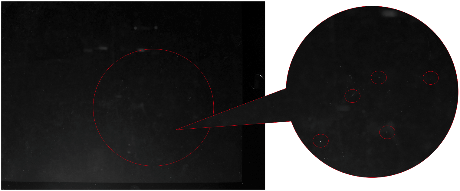 從效果圖上看迷你線光源3LINR220-W照射的灰塵顆粒要多,而且與實(shí)際面積大小相符,對應(yīng)的檢測精度要高;條形光源4BR15030-W只能檢測大灰塵顆粒,與實(shí)際面積對比有所差異。具體效果如下圖所示: