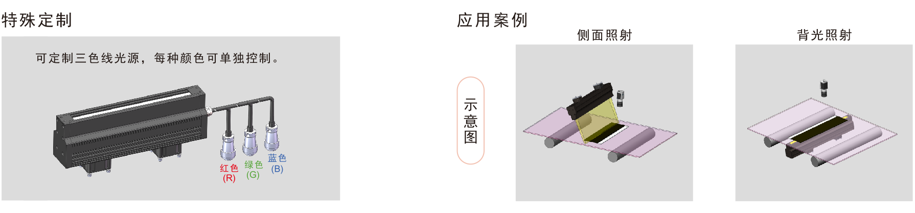 * 最長可定制5米。紫外和紅外光源可根據(jù)客戶要求定制。 * 發(fā)光峰值波長/相關色溫:紅色:620-630nm,綠色:525-530nm,藍色:465-470nm,白色:6600K(色溫) |