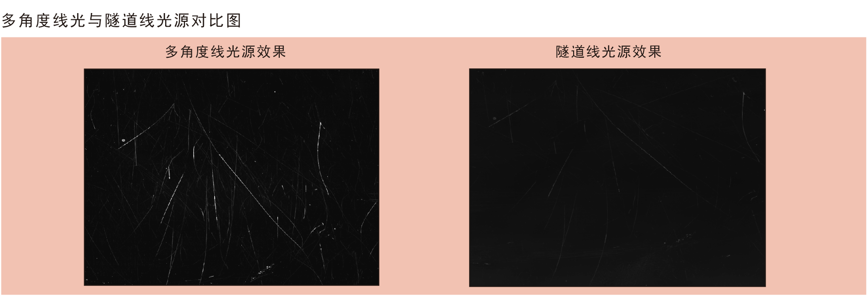 以上是多角度線光與隧道線光源的對(duì)比效果圖。多角度檢測(cè)劃痕,多個(gè)方向光路指向性強(qiáng),對(duì)比劃痕特征與背景會(huì)更加的明顯;而隧道線光源由于均勻性非常好,導(dǎo)致缺陷特征被均勻化,呈現(xiàn)劃痕與背景對(duì)比相對(duì)比較低。