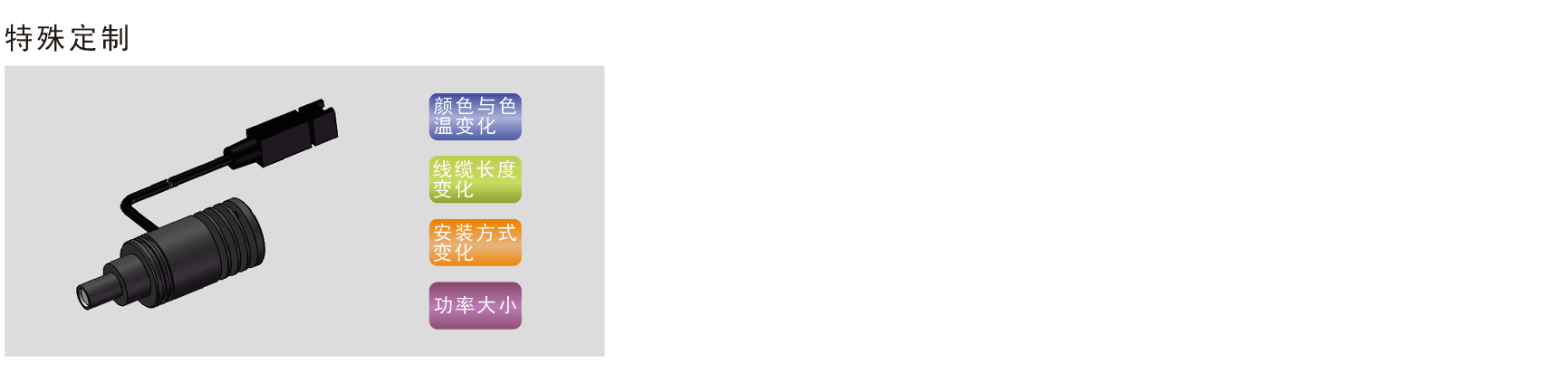 | 型號 | 電流/電壓 | 功率 | 顏色 | 照度(白光) | 重量 | 說明 | 適用電源 |