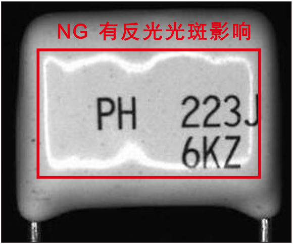圖1為環(huán)形無(wú)影光源照射,電容表面明顯看到一圈燈影,干擾字符識(shí)別;圖2為環(huán)形無(wú)影光源加偏振照射,電容表面無(wú)光斑干擾,字符清晰可見(jiàn)。