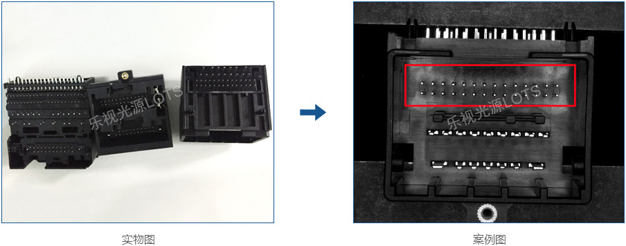 檢測汽車連接器針腳,使用高角度環(huán)形光垂直照射,使針尖部分的輪廓明顯,有利于機械手的抓取跟對位。