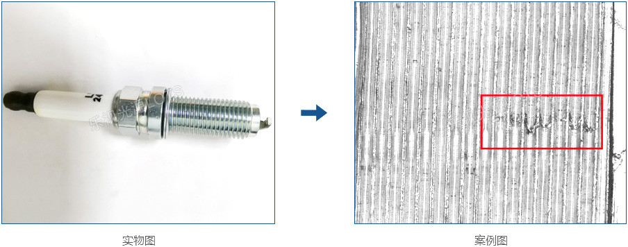 檢測火花塞螺牙缺陷,火花塞為圓柱形,使用線陣相機可良好展開螺牙,使用隧道線光源可使整個螺牙照射均勻,缺陷凸顯。
