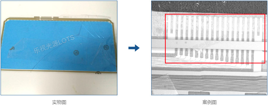檢測玻璃內(nèi)隱藏電路,隱藏電路薄且細小。選擇波長短的藍色同軸光源,垂直拍攝,隱藏電路打白。