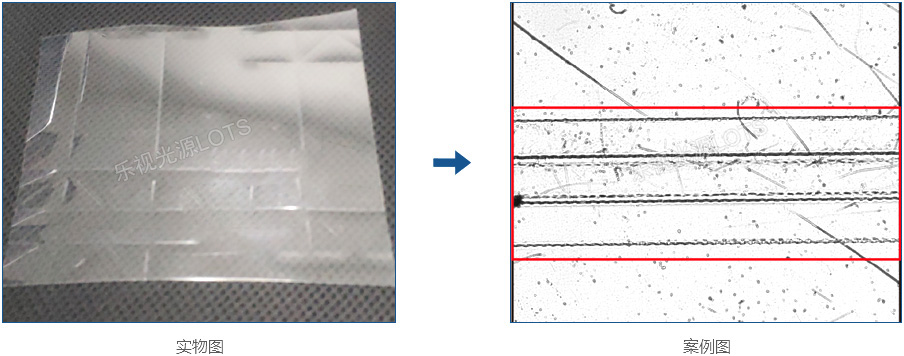 透明膜反光,正面打光會(huì)出現(xiàn)光斑,折痕不能充分體現(xiàn)出來,平行背光檢測折痕不明顯,用遠(yuǎn)心平行光源配合遠(yuǎn)心鏡頭,提高折痕的特征,折痕明顯呈現(xiàn)。