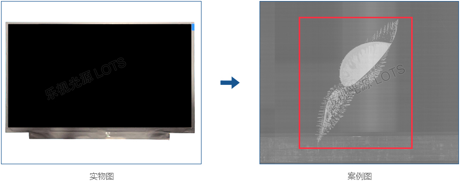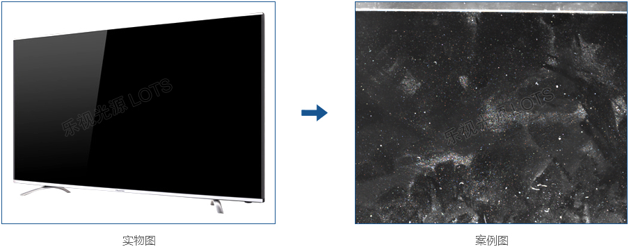 顯示器表面灰塵,常規(guī)的光源檢測(cè)無(wú)法全部呈現(xiàn)出灰塵,使用LCD暖色光,使灰塵能完全與底部黑色屏幕分割開(kāi),圖像效果明顯。