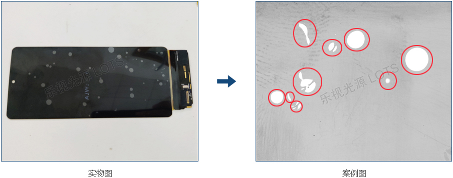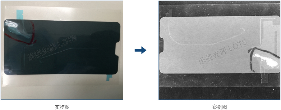屏幕中層膜貼合會有氣泡,使用同軸線光,能更好的突顯出氣泡,藍(lán)色可以有效的提升效果的對比度,更利于圖像處理。