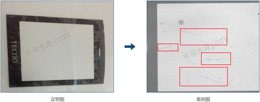 屏幕表面劃傷比較輕微,玻璃表面比較光滑,使用同軸光源能檢測出細(xì)微的劃傷,劃傷位置能有較高的對比度。