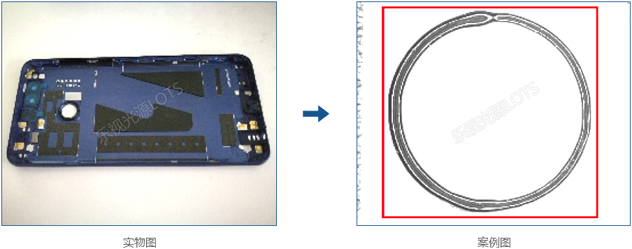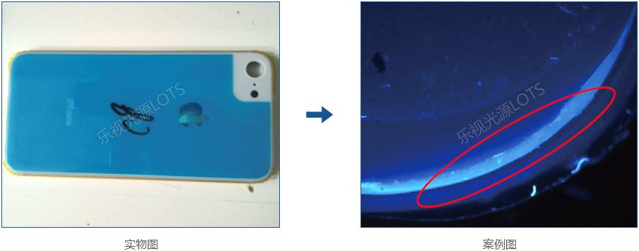 檢測特征為外殼邊緣膠水輪廓,采用紫外光波長短反射強,使膠未能穿透而 反光,加UV濾鏡更能增加對比。