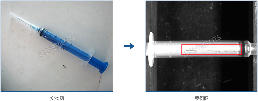 垂直打光會產(chǎn)生反光影響檢測,使用條形光低工作距離側面對打,打亮針筒外表面為白,油污不反光為黑。
